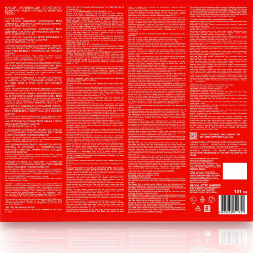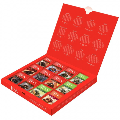 Чай ассорти Tess 60 пакетиков. Набор чая Tess включает в себя полное собрание (12 видов) оригинальных сортов черного, зеленого и травяного чаев. В наборе 60 пакетиков-пирамидок в термосаше. Каждый купаж в коллекции - это великолепный пример сочетания многовековых чайных традиций, новаторского стиля и вдохновенной импровизации. Коллекция представляет Sunrise, Ceylon, Majestic, Pleasure, Orange, Thyme, Goldberry, Style, Flirt, Lime, Flame, Cherry.Состав: черный чай, зеленый чай, ароматизатор, чабрец, цедра апельсина, цедра лимона, гибискус, лепестки календулы, клубника, шиповник, яблоко, лист черной смородины, вербена, айва, сафлор, лимонный сорго, цедра цитрусовых.Способ приготовления: залейте чай кипятком, дайте настояться 3-5 минут.Количество пакетиков в упаковке: 60 штук.Тип упаковки: картонная коробка.Условия хранения: хранить в чистом, хорошо вентилируемом помещении без посторонних запахов при относительной влажности воздуха не более 70%.Страна производства: Россия.