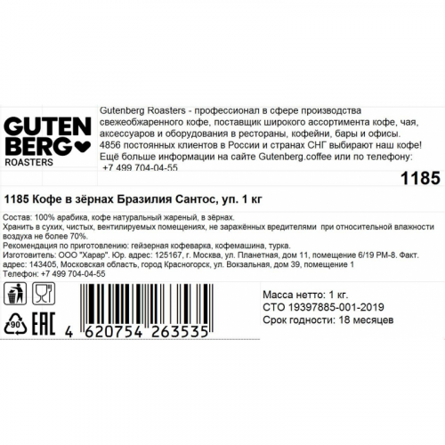 Кофе в зернах Gutenberg Бразилия Сантос подходит для приготовления в кофемашинах, турках, гейзерных кофеварках, а также для френч-пресса и чашек. Сорт арабики средней обжарки обеспечивает классический вкус с умеренной крепостью. Кофе упакован в пакет с клапаном дегазации, который сохраняет свежесть и аромат, предотвращая накопление газа внутри упаковки. Срок хранения составляет 18 месяцев при соблюдении условий хранения. Состав: 100% арабика. Энергетическая ценность на 100 г продукта составляет 3 ккал, белки - 0 г, жиры - 0 г, углеводы - 0 г. Вес упаковки 1 кг. Рекомендуемая доза для одной порции - 7-10 г кофе на 150-200 мл воды при температуре 90-95°C. Кофе предназначен для ценителей премиум-сегмента. Его характеристики обеспечивают уникальный вкус каждой чашки. Внешний вид и/или характеристики товара могут быть изменены производителем в соответствии с производственным процессом.