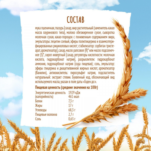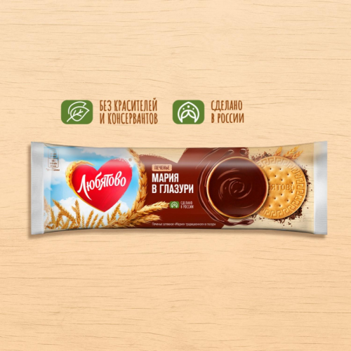 Печенье затяжное в глазури Любятово Мария 138 г Глазурь, тающая во рту, и хрустящее печенье "Мария" - это выразительный дуэт для любого чаепития. Благодаря новой рецептуре и натуральным злакам оно становится отличным выбором для всех, кто ценит сбалансированный вкус и аромат домашней выпечки. Состав: мука пшеничная, глазурь (сахар, жир растительный (заменитель какао масла лауринового типа), молоко обезжиренное сухое, сыворотка молочная сухая, какао-порошок с пониженным содержанием жира, эмульгаторы: лецитин соевый, эфиры глицерина и диацетилвинной и жирных кислот, сорбитан тристеарат; ароматизатор), сахар, масло растительное, сироп инвертный (сахар, регуляторы кислотности: молочная кислота, гидрокарбонат натрия), крахмал кукурузный, разрыхлители: гидрокарбонат аммония, гидрокарбонат натрия (сода пищевая); соль, эмульгатор: эфиры глицерина и диацетилвинной и жирных кислот, ароматизатор (Ванилин), антиокислитель: пиросульфит натрия, подсластитель натуральный: экстракт стевии. Пищевая ценность на 100 г: белки - 7 г, жиры - 17 г, углеводы - 72 г. Энергетическая ценность: 1990 кДж (470 ккал). ТУ 10.72.12-003-59045630-2016. Масса нетто: 138 г. Хранить не более 270 дней при температуре от +13 до +23 С. Срок годности: 9 месяцев. Страна производства: Россия.