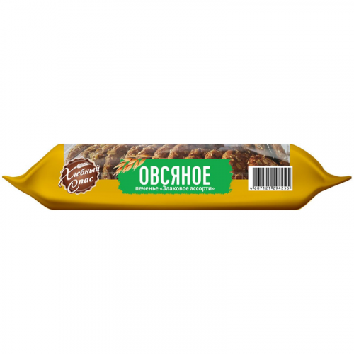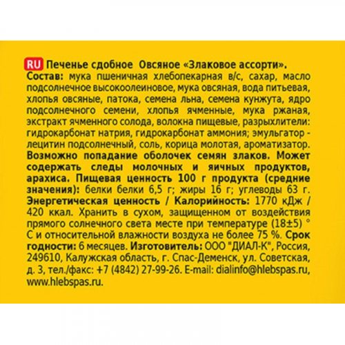Печенье сдобное Хлебный Спас Овсяное Злаковое ассорти 500 г Печенье "Овсяное злаковое ассорти" - это первое овсяное печенье в "мобильной" упаковке. Уникальный продукт, который содержит в себе максимальное количество полезных злаков и семян. Оригинальный внешний вид продукту придаёт обсыпка из 5 видов злаков (овсяные и ячменные хлопья, семена льна, кунжута, подсолнечника). Печенье обогащено витаминами и микроэлементами необходимыми для здоровой жизни человека. В составе печенья овсяная мука премиум качества и высокоолеионовое подсолнечное масло. Без пальмового масла и транс-жиров. Без ГМО. Без искусственных красителей, ароматизаторов и консервантов. Постный продукт. Состав: мука пшеничная хлебопекарная в/с, сахар, масло подсолнечное высокоолеиновое, мука овсяная, вода питьевая, семена кунжута, патока, мука ржаная, экстракт ячменного солода, волокна пищевые, эмульгатор - лецитин подсолнечный, разрыхлители: гидрокарбонат натрия, гидрокарбонат аммония, соль, имбирь молотый, корица молотая, ароматизатор. Пищевая ценность в 100 г: белки - 6,5 г, жиры - 16 г, углеводы - 63 г. Энергетическая ценность: 1 770 кДж (420 ккал). Вес: 500 г. Хранить при температуре (18+5) С. Срок годности: 6 месяцев. Страна производства: Россия.