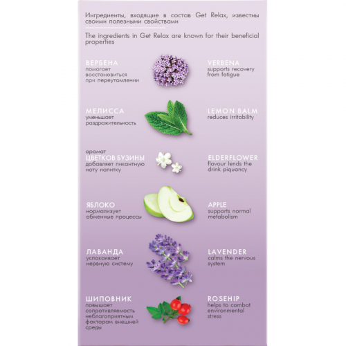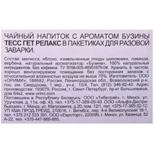 Чайный напиток травяной Tess Get Relax 20 пакетиков (бузина). Нежная травяная композиция Get Relax от Tess поможет восстановить внутренний баланс, вернуть ощущение покоя и безмятежности.Состав: вербена, мелисса, яблоко, шиповник, лаванда, аромат цветков бузины.Способ приготовления: залить чай кипятком, дать чаю настояться 3-5 минут.Количество пакетиков в упаковке: 20 штук.Тип упаковки: картонная коробка.Условия хранения: хранить в чистом, хорошо вентилируемом помещении без посторонних запахов при относительной влажности воздуха не более 70%.Страна производства: Россия.