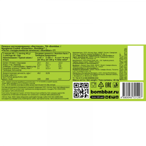 Печенье протеиновое Bombbar Фисташка 40 г Фисташки поддерживают здоровый уровень холестерина и баланс липидов в крови, снижают риск возникновения глазных болезней, улучшают перистальтику кишечника. Благодаря этому печенье становится идеальным выбором для людей, которые внимательно следят за своим здоровьем. Это печенье подходит для беременных и кормящих женщин, детей, спортсменов, диабетиков и тех, кто придерживается диеты. Оно отлично вписывается в рацион в любое время дня, будь то перекус после тренировки, десерт к чаю или кофе, или дополнение к протеиновым коктейлям. Состав: белки молочные (концентрат сывороточного белка, концентрат молочного белка), отруби овсяные (содержат глютен), изомальтоолигосахарид, фисташка, вода, подсластитель (эритрит), растительное масло, продукты яичные (меланж яичный), соль, ароматизаторы натуральные, регуляторы кислотности (гидрокарбонат натрия (сода пищевая), лимонная кислота), эмульгатор (соевый лецитин), антиокислитель (аскорбиновая кислота), подсластитель (сукралоза), консервант (сорбат калия), краситель натуральный (хлорофиллин). Содержит глютен. Содержит эритрит, при чрезмерном употреблении может оказывать слабительное действие. Может содержать незначительное количество арахиса, миндаля, кешью, фундука, фисташки, грецкого ореха. Пищевая ценность в 100 г: белки - 25 г, жиры - 12,7 г, углеводы - 7,5 г. Энергетическая ценность: 269 ккал. ТУ 10.72.12-006-06585958-2018. Вес: 40 г. Хранить в чистых, сухих, вентилируемых помещениях, не заражённых вредителями, в защищённом от прямых солнечных лучей месте, при температуре не выше 25 С. Срок годности: 12 месяцев. Страна производства: Россия.