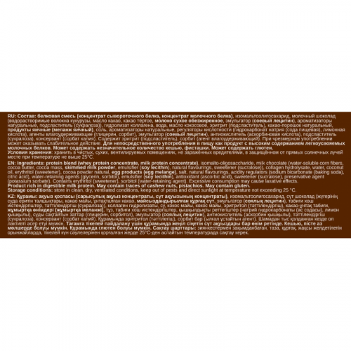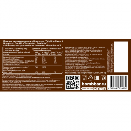 Печенье протеиновое Bombbar с шоколадом 60 г Печенье протеиновое Bombbar с шоколадом - это не только вкусное, но и полезное лакомство. Шоколад, входящий в его состав, снижает риск инсульта в среднем на 17%, а также является источником калия, цинка и селена. Благодаря этому печенье становится идеальным выбором для людей, которые внимательно следят за своим здоровьем. Это печенье подходит для беременных и кормящих женщин, детей, спортсменов, диабетиков и тех, кто придерживается диеты. Оно отлично вписывается в рацион в любое время дня, будь то перекус после тренировки, десерт к чаю или кофе, или дополнение к протеиновым коктейлям. Удобная упаковка позволяет брать его с собой в дорогу или в офис, что делает его идеальным вариантом для активных людей. Наслаждайтесь вкусом и пользой этого печенья, не отказывая себе в удовольствии. Состав: белки молочные (концентрат сывороточного белка, концентрат молочного белка), изомальтоолигосахарид, молочный шоколад (водорастворимые волокна кукурузы, масло какао, какао тёртое, молоко сухое обезжиренное, эмульгатор (соевый лецитин), ароматизаторы натуральные, подсластитель (сукралоза)), гидролизат коллагена, вода, масло кокосовое, подсластитель (эритрит), какао порошок натуральный, продукты яичные (меланж яичный), соль, ароматизаторы натуральные, регуляторы кислотности (гидрокарбонат натрия (сода пищевая), лимонная кислота), агент влагоудерживающий (глицерин), подсластитель (сорбит), эмульгатор (соевый лецитин), антиокислитель (аскорбиновая кислота), подсластитель (сукралоза), консервант (сорбат калия). Содержит эритрит, сорбит, при чрезмерном употреблении может оказывать слабительное действие. Может содержать незначительное количество кешью, фисташка. Может содержать глютен. Пищевая ценность в 100 г: белки - 35 г, жиры - 9,9 г, углеводы - 9,9 г. Энергетическая ценность: 299 ккал. Вес: 60 г. ТУ 10.72.12-006-06585958-2018. Хранить в чистых, сухих, вентилируемых помещениях, не заражённых вредителями, в защищённом от прямых солнечных лучей месте, при температуре не выше 25С. Срок годности: 12 месяцев. Страна производства: Россия.