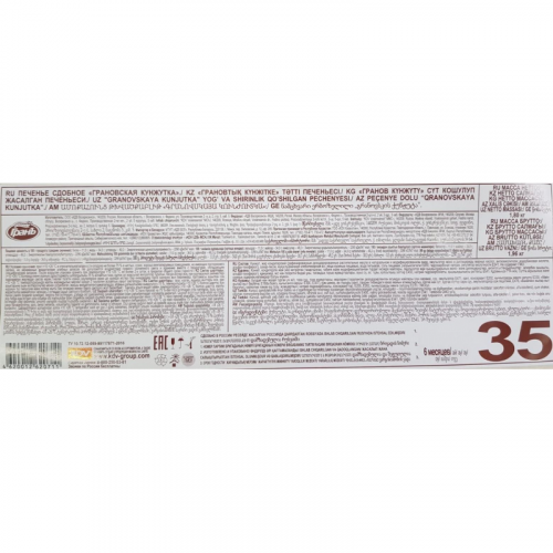 Печенье сдобное Грань Грановская кунжутка 1,8 кг Нежное и хрустящее печенье из сдобного бездрожжевого теста с высоким (30%) содержанием семени кунжута. В составе печенья: свежее отборное яйцо, сахар, мука высшего сорта, семя кунжута. Кунжут, содержащийся в продукте, богат кальцием, необходимым для формирования костей и укрепления нервной системы. Не содержит консервантов. Состав: кунжут, жир кондитерский (рафинированные дезодорированные растительные масла в натуральном и модифицированном виде, эмульгатор моно и диглицериды жирных кислот, антиокислители: аскорбиновая кислота, альфа-токоферол), сахар-песок, мука пшеничная хлебопекарная в/с, яйца куриные пищевые, вода питьевая, соль пищевая, разрыхлители Е450, гидрокарбонат натрия, регулятор кислотности Е541. Не содержит ГМО. Пищевая ценность в 100 г: белки - 11 г, жиры - 34 г, углеводы - 49,2 г. Энергетическая ценность: 547 ккал. Вес: 1,8 кг. Хранить при температуре от 10 до 26 C и относительной влажности не более 75%.