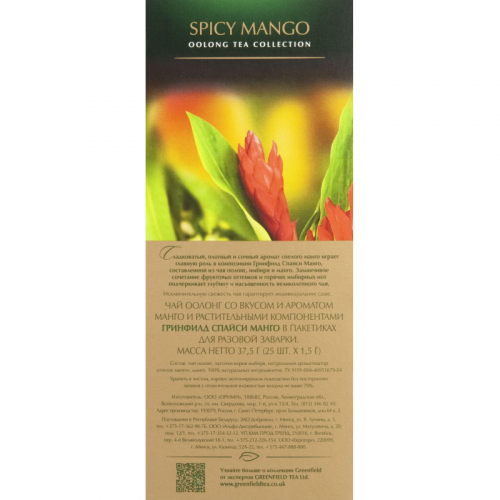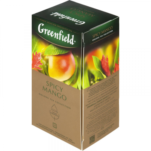 Чай улун Greenfield Spicy Mango 25 пакетиков. Чай улун Greenfield Spicy Mango с имбирем обладает сладковатым, насыщенным ароматом спелого манго, который является ключевым элементом композиции Greenfield Spicy Mango, созданной на основе чая оолонг, имбиря и манго. Привлекательное сочетание фруктовых оттенков и теплых имбирных нот подчеркивает глубину и насыщенность этого великолепного чая!Состав: чай оолонг, кусочки корня имбиря, манго, натуральный ароматизатор 'спелое манго'.Способ приготовления: залить чай кипятком, дать чаю настояться 2-3 минуты.Количество пакетиков в упаковке: 25 штук.Тип упаковки: картонная коробка.Условия хранения: хранить в чистом, хорошо вентилируемом помещении без посторонних запахов при относительной влажности воздуха не более 70%.Страна производства: Россия.