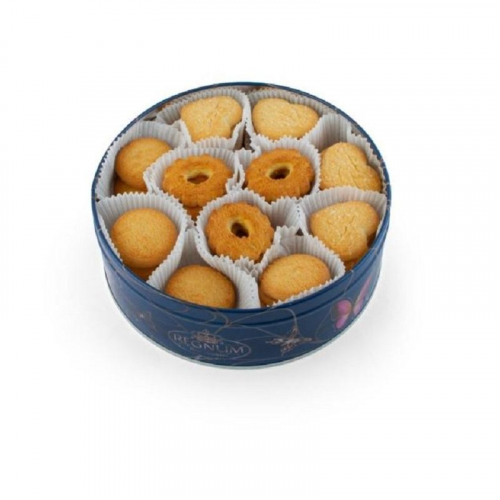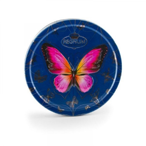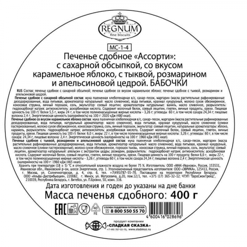 Печенье сдобное Сладкая Сказка Regnum Бабочки ассорти 400 г Внутри банки "Бабочки" всеми любимая классическая рецептура - сдобное печенье в форме круга с сахарной обсыпкой. Продукт станет не только отличным вариантом для презента, но и вкусным лакомством к чаю. После того, как печенье закончится, банку можно использовать для хранения разных мелочей или домашней выпечки. Продукт не содержит трансжиров. Состав: мука пшеничная хлебопекарная в/с, сахар-песок, маргарин (масла растительные рафинированные дезодорированные, вода питьевая, ароматизатор: масло сливочное), вода питьевая, крахмал кукурузный, молоко сухое обезжиренное, кокосовая стружка, яичный порошок, соль, эмульгатор: соевый лецитин, ароматизаторы натуральные: ваниль, масло сливочное, разрыхлитель: гидрокарбонат натрия, антиокислитель: аскорбиновая кислота. Содержит молочный белок, соевый лецитин, глютен яичные продукты, орехи. Пищевая ценность на 100 г: белки - 5,5 г; жиры - 24 г; углеводы - 60 г. Энергетическая ценность: 2020 кДж (480 ккал). Хранить при температуре (18 +/- 3) C и относительной влажности воздуха не более 75%. Срок годности: 12 месяцев. Страна производства: Россия.