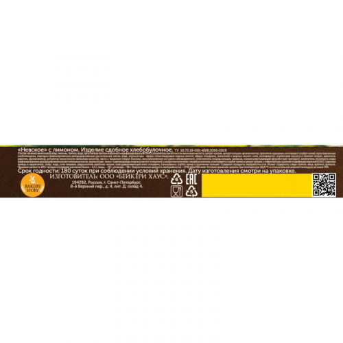 Печенье сдобное Bakery Story Невское с лимоном 245 г Это идеальное лакомство для любителей сладких печений с ярким цитрусовым ароматом. Нежное хлебобулочное изделие прекрасно сбалансировано по вкусу, благодаря добавлению лимона, который привносит лёгкую кислинку и освежающий акцент. Состав: начинка лимонная (сахар, лимоны, патока, вода, загустители пектин и крахмал модифицированный Е1442, регуляторы кислотности лимонная кислота, цитрат натрия, цитрат кальция, ароматизатор, краситель куркумин, консервант сорбат калия), мука пшеничная, маргарин (рафинированные дезодорированные растительные масла, вода, эмульгаторы: моно-и диглицериды жирных кислот, эфиры полиглицеридов жирных кислот, лецитин, соль, консервант сорбиновая кислота, краситель каротин, ароматизатор, регулятор кислотности лимонная кислота), паста с творогом (творог (молоко, восстановленное из сухого обезжиренного, уплотнитель хлорид кальция, закваска, молокосвертывающий ферментный препарат), заменитель молочного жира (рафинированные дезодорированные растительные масла, эмульгаторы моно- и диглицериды жирных кислот и лецитин), сыворотка молочная, пищевые волокна, консерванты сорбат калия и цитрат натрия, стабилизаторы крахмал модифицированный Е1442, гуаровая камедь и каррагинан), сахар, вода, соль, разрыхлитель карбонат натрия, влагоудерживающий агент глицерин, консерванты: сорбиновая кислота и пропионат кальция. Содержит продукты переработки сои. Может содержать следы орехов, яйца, арахиса, кунжута. Пищевая ценность в 100 г: белки - 6,5 г, жиры - 19 г, углеводы - 55 г. Энергетическая ценность: 1740 кДж (415 ккал). ТУ 10.72.19-001-65911095-2019. Вес: 245 г. Хранить при температуре (18+/-5) С и относительной влажности воздуха не выше 75%. Срок годности: 6 месяца. Страна производства: Россия.