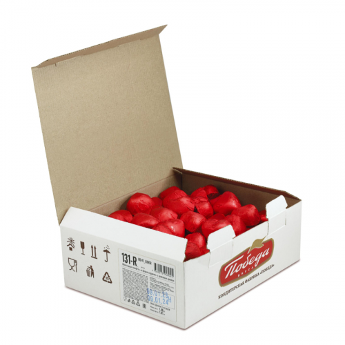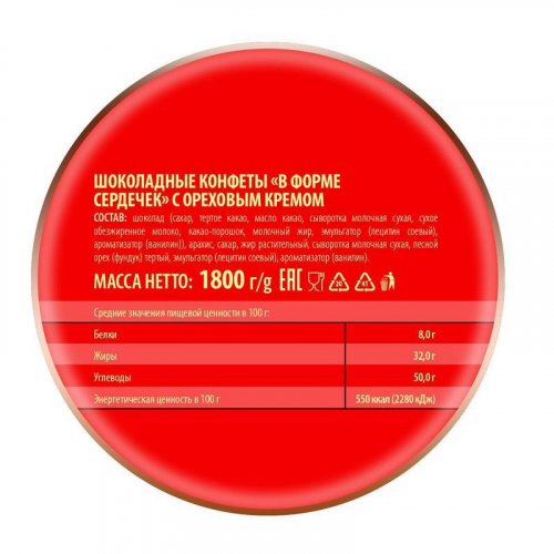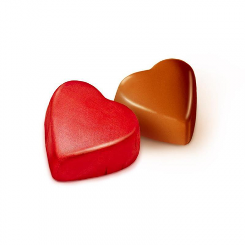 Конфеты в виде шоколадного 'сердечка' с нежным вкусом натурального молочного шоколада с ароматной ореховой начинкой, каждая конфетка завернута в фольгу. Состав: шоколад (сахар, тертое какао, масло какао, сыворотка молочная сухая, сухое обезжиренное молоко, какао-порошок, молочный жир, эмульгатор (лецитин соевый), ароматизатор (ванилин)), арахис, жир растительный, сыворотка молочная сухая, лесной орех (фундук) тертый, эмульгатор (лецитин соевый), ароматизатор (ванилин). Пищевая ценность в 100 г: белки - 8.0 г, жиры - 34 г, углеводы - 51 г. Срок годности: 12 месяцев. Энергетическая ценность: 540 ккал (2260 кДж). Хранить при температуре 18+/-3°C и относительно влажности воздуха не более 75%. Избегать воздействия прямых солнечных лучей. Страна производства: Россия.
