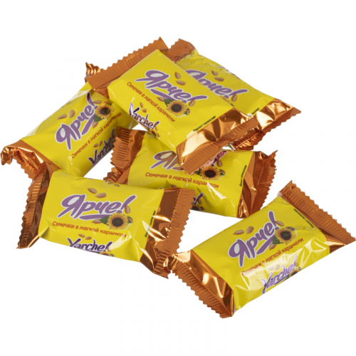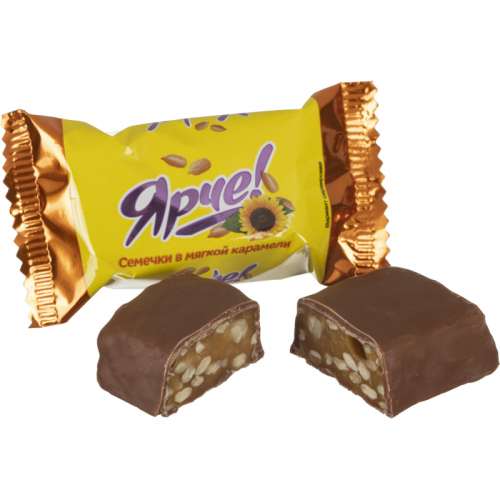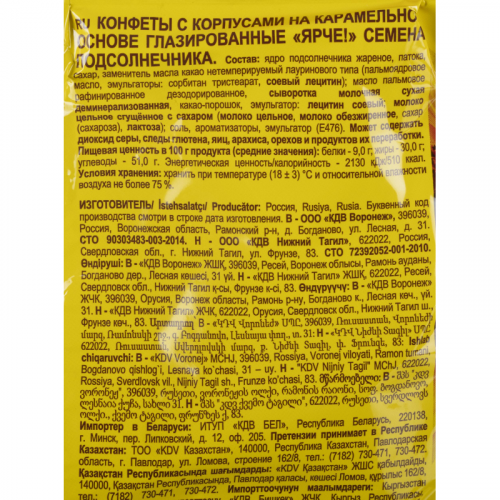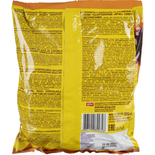 Конфета из мягкой карамели с жареными ядрами подсолнечника. Конфета покрыта глазурью. Состав продукта: ядро подсолнечника жареное, патока, сахар, заменитель масла какао нетемперируемый лауринового типа (пальмоядровое масло, эмульгаторы: сорбитан тристеарат, соевый лецитин); масло пальмовое рафинированное дезодорированное, сыворотка молочная сухая деминерализованная, какао-порошок, эмульгатор: лецитин соевый; молоко цельное сгущенное с сахаром (молоко цельное, молоко обезжиренное, сахар (сахароза), лактоза); соль, ароматизаторы, эмульгатор (Е476). Может содержать диоксид серы, следы глютена, яиц, арахиса, орехов и продуктов их переработки. Энергетическая ценность на 100 г: 510 ккал. Пищевая ценность: белки 9 г, жиры 30 г, углеводы 51 г. Условия хранения хранить при температуре (18+3) °С и относительной влажности воздуха не более 75%. Срок хранения 6 месяцев. Производитель: ООО "КДВ Нижний Тагил". Страна производства: Россия.