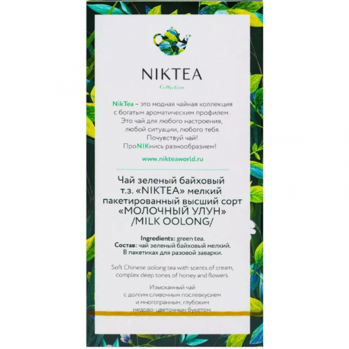Чай улун Niktea Milk Oolong 25 пакетиков. Полуферментированный зеленый чай с долгим сливочным послевкусием и многогранным, глубоким медово-цветочным букетом.Состав: чай зеленый (улун), аромат молока.Способ приготовления: залить чай кипятком, дать чаю настояться 3-5 минут.Количество пакетиков в упаковке: 25 штук.Тип упаковки: картонная коробка.Условия хранения: хранить в чистом, хорошо вентилируемом помещении без посторонних запахов при относительной влажности воздуха не более 70%.Страна производства: Россия.