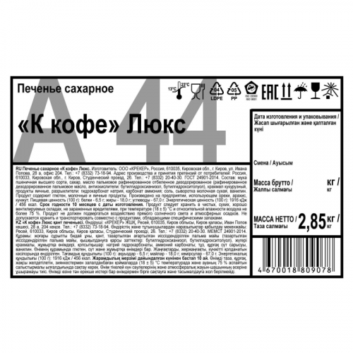 Печенье сахарное Дымка К кофе Люкс 2,85 кг Сахарное печенье "К кофе" - классическое сахарное печенье с ароматом топлёного молока. Вкусное сахарное печенье прекрасное дополнение к утреннему кофе и вечернему чаю. Высокорецептурное любимое сахарное печенье, отвечающее всем требованиям ГОСТ. Состав: мука пшеничная высшего сорта, сахар, маргарин (рафинированные дезодорированные растительные масла в натуральном и модифицированном виде (подсолнечное масло, пальмовое масло), вода, эмульгатор моно- и диглицериды жирных кислот, красители: аннато, куркумин; ароматизатор, регулятор кислотности лимонная кислота), продукты яичные, крахмал кукурузный, сыворотка молочная сухая, соль, разрыхлители: гидрокарбонат натрия, карбонат аммония; ароматизатор. Продукт содержит глютен, молочные и яичные продукты. Произведено на предприятии, использующем орехи, арахис, кунжут. Пищевая ценность в 100 г: белки - 7,5 г, жиры - 16,5 г, углеводы - 68 г. Энергетическая ценность: 451 ккал. Вес: 2,85 кг. Условия хранения: хранить при температуре (18+/-5) C, относительная влажность воздуха не более 75%. Срок: годности: 10 месяцев. Страна производства: Россия.