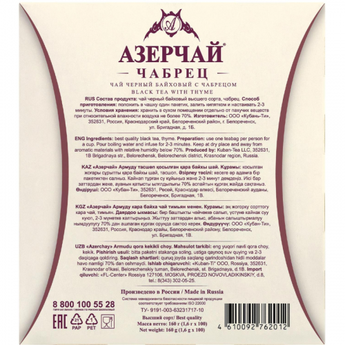 Чай черный Азерчай Армуду 100 пакетиков (чабрец). Чай Армуду Чабрец, содержит большое количество витаминов, является прекрасным антисептиком. Пряный аромат и неповторимый яркий вкус чабреца дополнены изысканной терпкостью черного чая. Ароматный и насыщенный полезными микроэлементами чабрец улучшает настроение, нормализует пищеварение и помогает при бессоннице.Состав: чай черный байховый высшего сорта, чабрец.Способ приготовления: залить чай кипятком, дать чаю настояться 3-5 минут.Количество пакетиков в упаковке: 100 штук. Тип упаковки: картонная коробка.Условия хранения: хранить в чистом, хорошо вентилируемом помещении без посторонних запахов при относительной влажности воздуха не более 70%.Страна производства: Россия.