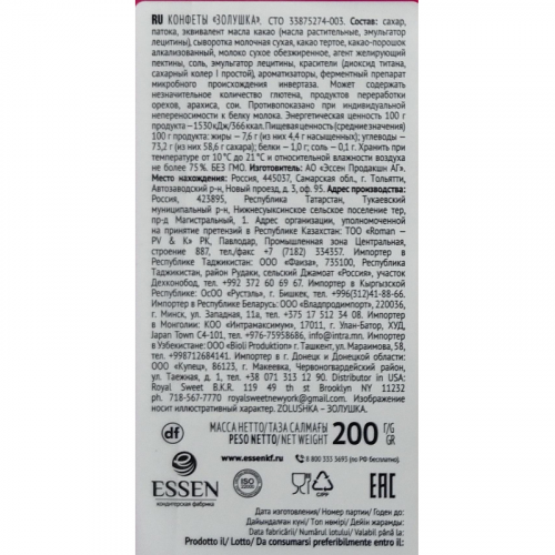 Конфеты Золушка представляют собой нежную молочную начинку в корпусе из желейной массы со сливочным вкусом, покрыты ароматной глазурью. Конфеты Золушка сделают ваше чаепитие сказочно приятным и вкусным! Состав: сахар, патока, масла растительные, какао-порошок алкализованный, молоко сухое обезжиренное, агент желирующий пектины, эмульгатор лецитин соевый, ферментный препарат микробного происхождения инвертаза, красители (диоксид титана, сахарный колер I простой), ароматизаторы. Может содержать незначительное количество глютена, яичного белка, продуктов переработки орехов, арахиса. Без ГМО. Противопоказано при индивидуальной непереносимости к белку молока. Вес: 200 г. Пищевая ценность (средние значения) 100 г продукта: жиры - 8,0 г (из них 5,5 г насыщенных); углеводы - 72,0 г (из них 45,6 г сахара); белки - 1,5 г. Энергетическая ценность 100 г продукта: 1550 кДж, 370 ккал. Срок годности: 12 месяцев. Условия хранения: при температуре от 10°С до 21°С и относительной влажности воздуха не более 75%. Производитель: АО "Эссен Продакшн АГ" Страна производства: Россия.