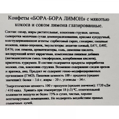 Конфеты шоколадные Bora-Bora Лимон 1 кг. Состав: сахар, жиры растительные, кокосовая стружка, патока, сыворотка молочная сухая деминерализованная, крахмал кукурузный, влагоудерживающие агенты: сорбитовый сироп, глицерин; пищевые волокна, эмульгаторы: лецитин соевый, E471, Е492, E476; сок лимона, ароматизаторы, соль, лимонная кислота, желирующий агент каррагинан, комплексная пищевая добавка (антиокислители смесь токоферолов, аскорбиновая кислота), краситель куркумин. Пищевая ценность 100 г продукта (среднее значение): белки - 3,6 г, жиры - 20 г, углеводы - 54 г. Энергетическая ценность 100 г продукта (среднее значение): 1720 кДж, 410 ккал. Срок годности: 9 месяцев. Хранить при температуре 18 (+3)°С, относительной влажности воздуха не более 75% в сухих, чистых, хорошо вентилируемых помещениях. Не подвергать воздействию прямых солнечных лучей. Страна производства: Россия.