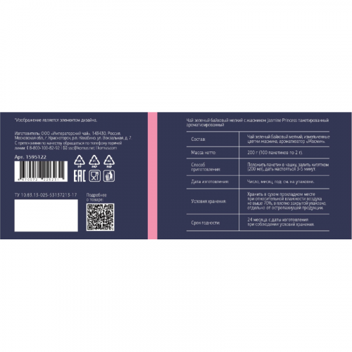 Чай зеленый Деловой стандарт Jasmine Princess 100 пакетиков. В уникальной композиции чая Jasmine Princess мы соединили сбалансированные нежные ароматы чистого зеленого чая с ароматом цветов жасмина. Чай обладает нежным вкусом и полным цветочным ароматом. Заваривая чай слишком долго или в слишком горячей воде, вы рискуете получить слишком горький жасминовый чай. 'Selected quality' - это новая яркая серия восхитительных чаев и настоев с уникальным характером. Купажи самого высокого качества созданы из отборных сортов лучших чайных плантаций мира. Каждая смесь уникальна, так как является вдохновением дегустаторов чая, которые выбрали лучшее, исключительно для ценителей чая. Побалуй себя изысканным ярким вкусом!Состав: чай зеленый байховый мелкий, измельченные цветки жасмина, ароматизатор 'Жасмин'.Способ приготовления: залить чай кипятком, дать чаю настояться 3-5 минут.Количество пакетиков в упаковке: 100 штук. Тип упаковки: картонная коробка.Условия хранения: хранить в чистом, хорошо вентилируемом помещении без посторонних запахов при относительной влажности воздуха не более 70%.Страна производства: Россия.