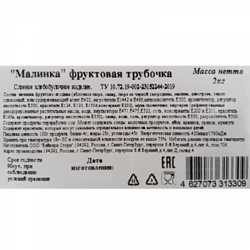 Печенье слоёное Bakery Story Трубочка Малинка 2 кг Изделие из слоёного теста с большим количеством начинки со вкусом малины. Состав: начинка фруктовая с ароматом малины (яблочное пюре, сахар, пюре из чёрной смородины, малина, антиокислитель аскорбиновая кислота, ароматизатор, регулятор кислотности лимонная кислота, краситель Е124, консервант сорбат калия), мука пшеничная хлебопекарная, маргарин (рафинированные дезодорированные растительные масла, вода, эмульгаторы: Е472с и Е475; соль, консерванты сорбиновая кислота и бензоат натрия, краситель каротин, ароматизатор, регулятор кислотности лимонная кислота), сахар, вода, соль пищевая, дрожжи хлебопекарные, регулятор кислотности лимонная кислота, подсолнечное масло, белок гороховый, декстроза, мальтодекстрины, крахмал кукурузный. Может содержать следы молочных продуктов, яйца, арахиса, орехов, кунжута. Содержит краситель, который может оказывать отрицательное влияние на активность и внимание детей. Пищевая ценность на 100 г: белки - 4,0 г, жиры - 25 г, углеводы - 45 г. Энергетическая ценность: 1760 кДж (420 ккал). Хранить при температуре (18+/-5) С и относительной влажности воздуха не выше 75%. Избегать резких перепадов температур.