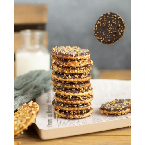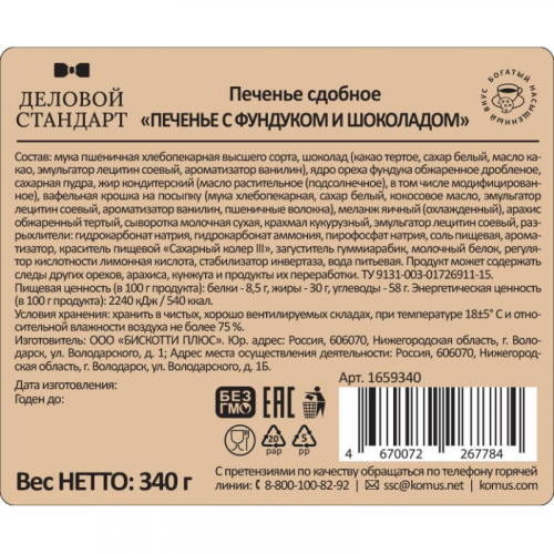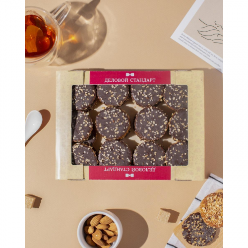 Печенье сдобное в глазури Деловой Стандарт с фундуком и шоколадом 340 г Нежное хрустящее печенье, декорированное по верхней поверхности дроблёным фундуком. Нижняя часть печенья покрывается тёмным шоколадом, поверх которого идёт посыпка бисквитными хлопьями, которые не позволяют шоколаду таять в руках. Это создаёт удивительный насыщенный вкус, который понравится и взрослым, и детям. Состав: мука пшеничная хлебопекарная высшего сорта, шоколад (какао тёртое, сахар белый, масло какао, эмульгатор лецитин соевый, ароматизатор ванилин), ядро ореха фундука обжаренное дроблёное, сахарная пудра, жир кондитерский (масло растительное (подсолнечное), в том числе модифицированное), вафельная крошка на посыпку (мука хлебопекарная, сахар белый, кокосовое масло, эмульгатор лецитин соевый, ароматизатор ванилин, пшеничные волокна), меланж яичный (охлаждённый), арахис обжаренный тёртый, сыворотка молочная сухая, крахмал кукурузный, эмульгатор лецитин соевый, разрыхлители: гидрокарбонат натрия, гидрокарбонат аммония, пирофосфат натрия, соль пищевая, ароматизатор, краситель пищевой "Сахарный колер III", загуститель гуммиарабик, молочный белок, регулятор кислотности лимонная кислота, стабилизатор инвертаза, вода питьевая. Продукт может содержать следы других орехов, кунжута и продукты их переработки. Пищевая ценность в 100 г продукта: белки - 8,5 г, жиры - 30 г, углеводы - 58 г. Энергетическая ценность: 2240 кДж / 540 ккал. Хранить в чистых, хорошо вентилируемых складах, при температуре от 13 до 23 С и относительной влажности воздуха не более 75 %.