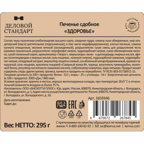 Печенье сдобное Деловой Стандарт Здоровье 295 г Полезное печенье для активных людей содержит в своём составе овсяные хлопья, которые дают заряд бодрости и сил, снижают уровень холестерина, способствуют снижению лишнего веса; кунжут, который содержит белки, витамины группы, А, Е, В, кальций, магний, цинк, полинасыщенные кислоты, отвечающие за снижение холестерина в крови; семена льна - кладезь полиненасыщенных кислот (Омега 3, Омега 6, Омега 9), которые повышают иммунитет и жизненный тонус, содержат витамины группы F, А, Е и В. Состав: мука пшеничная хлебопекарная высшего сорта, сахарная пудра, семена льна обжаренные, жир кондитерский (масло растительное (подсолнечное), в том числе модифицированное), хлопья овсяные, семена кунжута очищенные, меланж яичный (охлаждённый), разрыхлители: сухая смесь для разрыхления теста (крахмал пшеничный, разрыхлители: пирофосфат натрия, гидрокарбонат натрия, сухое обезжиренное молоко, сухой глюкозный сироп, ароматизатор "Творог", эмульгаторы: моно- и диглицериды жирных кислот, эфиры полиглицеридов и жирных кислот, соль пищевая, казеинат натрия), гидрокарбонат аммония, гидрокарбонат натрия, солодовый экстракт, эмульгатор лецитин соевый, сок яблочный концентрированный, крахмал кукурузный, соль пищевая, краситель пищевой "Сахарный колер III", корица, загуститель гуммиарабик, молочный белок, регулятор кислотности лимонная кислота, стабилизатор инвертаза, вода питьевая. Продукт может содержать следы других орехов, арахиса, кунжута и продукты их переработки. Пищевая ценность на 100 г: белки - 9,5 г, жиры - 25 г, углеводы - 54 г. Энергетическая ценность: 2000 кДж (480 ккал). Хранить в чистых, хорошо вентилируемых складах, при температуре от 13 до 23 С и относительной влажности воздуха не более 75 %.
