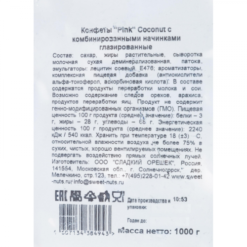 Конфеты мини-формата Pink "Coconut", подходящие в качестве десерта к чаю или кофе. Внутри слоя нежнейшей шоколадной глазури имеется начинка из нежного сливочного крема с ароматом кокоса. Конфеты шарообразной формы упакованы в пленку с традиционным оформлением. Вес: 1000 г. Состав: сахар, жиры растительные, какао-порошок, сыворотка молочная сухая деминерализованная, патока, эмульгаторы: лецитин соевый, Е476; ароматизаторы, краситель сахарный коллер Е150d, комплексная пищевая добавка (антиокислители альфа-токоферол, аскорбиновая кислота). В составе содержатся продукты переработки молока и сои. Возможно содержание следов орехов, арахиса, продуктов переработки яиц. Продукт не содержит генно-модифицированных организмов (ГМО). Пищевая ценность 100 г продукта (среднее значение): белки - 5 г, жиры - 36 г, углеводы - 56 г. Энергетическая ценность 100 г продукта (среднее значение): 2360 кДж, 565 ккал. Срок годности: 9 месяцев. Хранить при температуре от 15 до 21 °С, относительной влажности воздуха не более 75% в сухих, чистых, хорошо вентилируемых помещениях. Не подвергать воздействию прямых солнечных лучей. Страна производства: Россия.