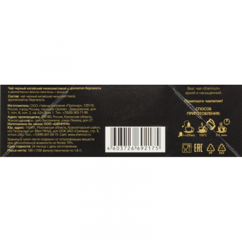 Чай черный Shennun 100 пакетиков (бергамот). Чай черный мелколистовой с ароматом бергамота 'Shennun' - знаменитый китайский чай, завоевавший весь мир. Название марки 'Шень Нун' (Shennun) - имя легендарного 'Божественного земледельца', который оставил человечеству в наследство многие исцеляющие рецепты из трав и корней, именно он подарил цивилизации свое величайшее изобретение - чай. Чай выращен на природных плантациях округа Цзиньчжоу, где 'Божественный земледелец' впервые открыл замечательные свойства этого напитка. Как гласят легенды, от произнесения одного имени Шень Нун к людям возвращалась сила.Состав: чай 75% черный мелколистовой китайский, 15% цедра лимона, ароматизатор натуральный пищевой 'бергамот'.Способ приготовления: залить чай кипятком, дать чаю настояться 3-5 минут.Количество пакетиков в упаковке: 100 штук. Тип упаковки: картонная коробка.Условия хранения: хранить в чистом, хорошо вентилируемом помещении без посторонних запахов при относительной влажности воздуха не более 70%.Страна производства: Китай.