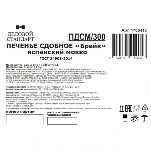 Печенье сдобное Деловой Стандарт Испанский Мокко (300 штук по 4,5 г) Печенье "Деловой Стандарт" - хрустящее лакомство, на основе пшеничной муки с кофейным вкусом. Отлично подойдёт для небольшого перекуса за чайной паузой дома или на работе! Каждое печенье упаковано индивидуально, поэтому его удобно брать с собой, а также расположить в зонах переговорной, шоу-рума или ресепшен. Хрустящий вкус и пряный ароматный - заряд энергии на целый день. Состав: мука пшеничная хлебопекарная в/ с , маргарин (рафинированные дезодорированные масла в натуральном и модифицированном виде (пальмовое масло, подсолнечное масло), эмульгаторы (Е471, Е475, Е322), ароматизатор "Испанский мокко", соль пищевая, краситель Е160а, регулятор кислотности лимонная кислота, сахар белый кристаллический, вода питьевая, инвертный сахарный сироп, сухой яичный белок, агент влагоудерживающий пропиленгликоль Е1520, консерванты Е260, Е262(i), Е281. Содержит соевый лецитин. Продукт не является ГМО, не содержит и не был изготовлен из генетически модифицированных организмов. Пищевая ценность на 100 г: белки - 7,4 г, углеводы - 75 г, жиры - 22 г. Энергетическая ценность: 2224 кДж (530 ккал). Соответствует требованиям ТР ТС 021/2011 "О безопасности пищевой продукции", ГОСТ 24901 - 2014. Масса нетто: 1350 г. Хранить при температуре не более 18+/-5 С, относительной влажности не более 75%. Срок годности: 6 месяцев. Страна производства: Россия