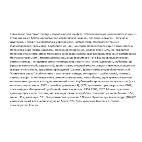 Уникальное сочетание текстур и вкусов в одной конфете: обволакивающая шоколадная глазурь из отборных какао-бобов, ореховые ноты пралиновой начинки, два вида карамели - тягучая и хрустящая, и пикантные кристаллы морской соли. Состав: сахар, масла растительные (пальмоядровое, пальмовое, подсолнечное, ши), консервы молокосодержащие с заменителем молочного жира (сахар (сахароза), молоко обезжиренное, молоко сухое цельное, сыворотка молочная сухая, заменитель молочного жира (рафинированные дезодорированные растительные масла в натуральном и модифицированном виде (пальмовое и его фракции, подсолнечное), антиокислитель - концентрат смеси токоферолов), загуститель - мальтодекстрин, стабилизатор (крахмал кукурузный, каррагинан), ароматизатор пищевой (масло сладко-сливочное, концентрат сывороточного белка, ароматизатор пищевой "Сливки", ароматизатор пищевой натуральный "Сливочное масло", стабилизатор - ксантановая камедь, консервант - сорбат калия), лактоза); патока, сыворотка молочная сухая деминерализованная, какао тертое, ядро арахиса жареного, молоко сухое цельное, влагоудерживающий агент: сорбитовый сироп; какао-порошок, соль (в т.ч. морская), эмульгаторы: Е322 (соевый, подсолнечный), Е476; ароматизаторы, загуститель: Е407; орех миндаль обжаренный дробленый, антиокислители: Е304, Е306, Е307. Может содержать диоксид серы, следы глютена, яиц и продуктов их переработки. Пищевая ценность: белки - 3.5 г, жиры - 31 г, углеводы - 57 г. Энергетическая ценность: 520 ккал. Срок хранения: 8 месяцев. Хранить при температуре от 15°С до 21°С и относительной влажности воздуха не более 75%. Масса нетто: 500 г. Страна производства: Россия.