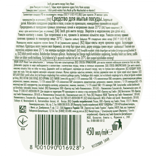 Средство для мытья посуды Fairy Ромашка и Витамин Е гель 0,45 лНазначение: средство предназначено для мытья различной посуды от различных загрязнений. Образует обильную и устойчивую пену. Растворяет жир даже в холодной воде. Мягкий для рук.Способ применения: для мытья нанесите небольшое количество средства на губку или посуду. Добавляйте средство по мере необходимости. После мытья ополосните посуду.Меры предосторожности: беречь от детей. Избегать попадания в глаза. При попадании в глаза тщательно промыть их водой.Состав: 5%-15% анионные ПАВ; <5% неионогенные ПАВ. Дополнительно: отдушка, консерванты, цитронеллол, лимонен, линалоол.Условия хранения: предохранять от воздействия прямых солнечных лучей и нагревания выше 35 C.Срок годности: 18 месяцев с даты изготовления (дату изготовления см. на упаковке).