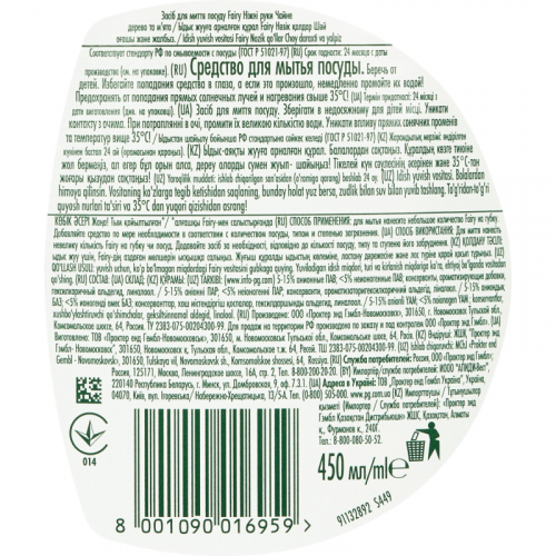 Средство для мытья посуды Fairy Чайное дерево и Мята гель 0.45 л с дозаторомНазначение: средство предназначено для мытья различной посуды от различных загрязнений. Образует обильную и устойчивую пену. Растворяет жир даже в холодной воде. Мягкий для рук.Способ применения: для мытья нанесите небольшое количество средства на губку или посуду. Добавляйте средство по мере необходимости. После мытья ополосните посуду.Меры предосторожности: беречь от детей. Избегать попадания в глаза. При попадании в глаза тщательно промыть их водой.Состав: 5%-15% анионные ПАВ; <5% неионогенные ПАВ. Дополнительно: отдушка, консерванты, гексилкоричный альдегид, линалоол.Условия хранения: предохранять от воздействия прямых солнечных лучей и нагревания выше 35 C.Срок годности: 18 месяцев с даты изготовления (дату изготовления см. на упаковке).