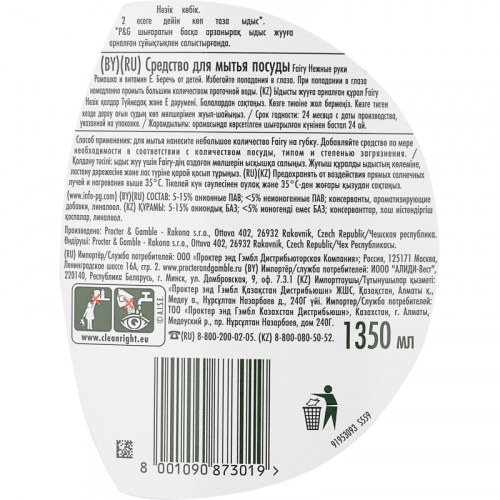 Средство для мытья посуды Fairy Ромашка и Витамин Е гель 1.35 л с дозатором Назначение: гель для мытья посуды. Концентрированная формула с Пена-Эффектом глубоко проникает в жир и расщепляет его изнутри. А активные компоненты эффективно растворяют жир в холодной воде.Способ применения: дозировка: используйте одну каплю, общий объём зависит от степени и вида загрязнения. Для мытья нанесите небольшое количество Fairy на губку.Меры предосторожности: Беречь от детей. Избегайте попадания в глаза. При попадании в глаза немедленно промыть большим количеством проточной воды.Состав: 5-15% анионные ПАВ,<5% неионогенные ПАВ, консерванты, ароматизирующие компоненты, гераниол.Условия хранения: хранить в сухом прохладном месте. Предохранять от попадания прямых солнечных лучей.Срок годности: 24 месяца с даты изготовления (дату изготовления см. на упаковке).