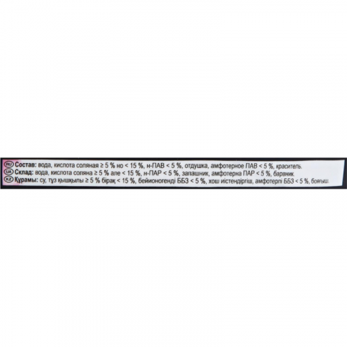 Чистящее средство для унитазов Туалетный Утенок гель Суперсила Видимый эффект 900 мл. Назначение. Супер эффективная формула чистящего средства для унитаза Туалетный Утенок "Видимый Эффект" справляется с самыми сложными проблемами: Удаляет стойкие пятна, включая ржавчину и до 100% изветкового налета, эффективна даже под водой. Убивает 99,99% микробов, включая вирусы, аналогичные по устойчивости SARS-COV-2, вызывающему COVID-19x. Благодаря уникальной форме горлышка бутылки лучше попадает в труднодоступные места скопления бактерий под ободком унитаза. Гель меняет цвет во время очищения, а значит вы можете видеть, как он работает! Дезинфицирующий эффект в отношении исследованных вирусов (Poliovirus, Adenovirus) достигается при экспозиции 15 минут. Суперэффективная формула Туалетный Утенок Суперсила Видимый эффект справляется с самыми сложными проблемами: удаляет самые стойкие пятна, включая ржавчину и известковый налет; глубокое очищение даже под водой. Меняет цвет во время очищения. Способ применения. Для максимального результата: после нанесения средства используйте ершик для очистки поверхностей над и под водой. Для удаления загрязнений в нижней части унитаза налейте средство в воду и оставьте на 60 минут, смойте. Плотно закрутите колпачок. Используйте регулярно для поддержания чистоты и свежести в туалете. Меры предосторожности. Опасно! При попадании на кожу и в глаза вызывает химические ожоги. Может вызвать коррозию металлов. Токсично для водных организмов с долгосрочными последствиями. Использовать только по назначению. Беречь от детей. При необходимости обратиться за медицинской помощью, показать маркировку продукта. Не смешивать с другими чистящими и отбеливающими средствами. Избегать попадания в окружающую среду. Не вдыхать пары, не допускать попадания средства в глаза, на кожу и одежду. Использовать резиновые перчатки, средства защиты глаз/лица. После работы тщательно вымыть руки. При вдыхании: Свежий воздух, покой. При попадании на кожу (или волосы): Немедленно снять всю загрязненную одежду, кожу обильно промыть водой или под душем. при поподании в глаза: Осторожно промыть глаза водой в течение нескольких минут. Снять контактные линзы, если Вы ими пользуетесь и если это легко сделать. Продолжить промывание глаз. При проглатывании: Прополоскать рот. Не вызывать рвоту. Немедленно обратиться за медицинской помощью. Состав. вода, кислота соляная > 5%, но < 15%, н-ПАВ < 5%, отдушка, амфотерные ПАВ < 5%, краситель. Условия хранения. Хранить плотно закрытым, только в упаковке завода-изготовителя, в вертикальном положении, в недоступном для детей и посторонних месте, отдельно от пищевых продуктов, при температуре от -5 °C до 25 °C. Срок годности. 24 месяца
