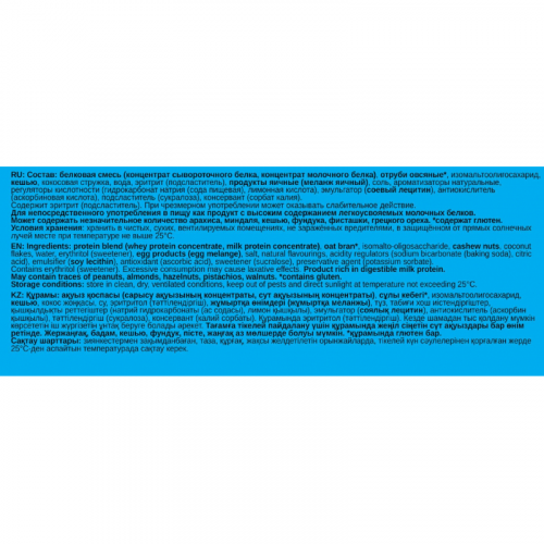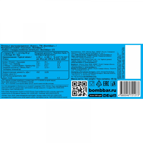 Печенье протеиновое Bombbar с кокосом 40 г Кокос - источник клетчатки и витамина В6, помогает при профилактике с атеросклероза. Стимулирует работу кишечника, нормализует процессы переваривания пищи и всасывания питательных веществ. Благодаря этому печенье становится идеальным выбором для людей, которые внимательно следят за своим здоровьем. Это печенье подходит для беременных и кормящих женщин, детей, спортсменов, диабетиков и тех, кто придерживается диеты. Оно отлично вписывается в рацион в любое время дня, будь то перекус после тренировки, десерт к чаю или кофе, или дополнение к протеиновым коктейлям. Состав: белки молочные (концентрат сывороточного белка, концентрат молочного белка), отруби овсяные (содержат глютен), изомальтоолигосахарид, кешью, кокосовая стружка, вода, подсластитель (эритрит), продукты яичные (меланж яичный), соль, ароматизаторы натуральные, регуляторы кислотности (гидрокарбонат натрия (сода пищевая), лимонная кислота), эмульгатор (соевый лецитин), антиокислитель (аскорбиновая кислота), подсластитель (сукралоза), консервант (сорбат калия). Содержит глютен. Содержит эритрит, при чрезмерном употреблении может оказывать слабительное действие. Может содержать незначительное количество арахиса, миндаля, кешью, фундука, фисташки, грецкого ореха. Пищевая ценность в 100 г: белки - 25 г, жиры - 12,3 г, углеводы - 8,3 г. Энергетическая ценность: 269 ккал. ТУ 10.72.12-006-06585958-2018. Вес: 40 г. Хранить в чистых, сухих, вентилируемых помещениях, не заражённых вредителями, в защищённом от прямых солнечных лучей месте, при температуре не выше 25 С. Срок годности: 12 месяцев. Страна производства: Россия.