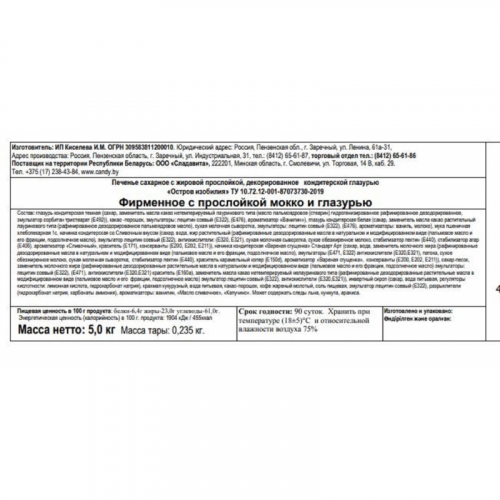 Печенье сахарное в глазури Остров изобилия Мокко 5 кг. Печенье с кофейной начинкой и глазурью. Состав: глазурь кондитерская тёмная (сахар, заменитель масла какао нетемперируемый лауринового типа (масло пальмоядерное (стеарин) гидрогенизированное рафинированное дезодорированное, эмульгатор сорбитан тристеарат (Е492)), какао-порошок, эмульгаторы: лецитин соевый (Е322), (Е476), ароматизатор "Ванилин") глазурь кондитерская белая (сахар, заменитель масла какао растительный лауринового типа (рафинированное дезодорированное пальмоядровое масло), сухая молочная сыворотка, эмульгаторы: лецитин соевый (Е322), (Е476), ароматизаторы: ваниль, молоко), мука пшеничная хлебопекарная 1с, начинка кондитерская со сливочным вкусом (сахар, вода, жир растительный, эмульгатор лецитин соевый (Е322), антиокислители: (Е320, Е321), сухая молочная сыворотка, сухое обезжиренное молоко, стабилизатор пектин (Е440), стабилизатор агар (Е406), ароматизатор "Сливочный", краситель (Е171), консерванты (Е200, Е202, Е211)), начинка кондитерская "Варёная сгущёнка" Стандарт Арт (сахар, вода, заменитель молочного жира, эмульгаторы (Е471, Е322), антиокислители (Е320 Е321), патока, сухое обезжиренное молоко, сухая молочная сыворотка, стабилизатор пектин (Е440), краситель карамельный колер (Е150d), ароматизатор "Варёная сгущёнка", консерванты (Е200, Е202, Е211)), сахар-песок, заменитель молочного жира (рафинированные дезодорированные растительные масла в натуральном и модифицированном виде (пальмовое масло и его фракции, подсолнечное масло), эмульгаторы: лецитин соевый (Е322), (Е471), антиокислители (Е320, Е321) краситель (Е160а)), заменитель масла какао нетерперируемый нелауринового типа (рафинированные дезодорированные растительные масла в модифицированном виде (пальмовое масло и его фракции, подсолнечное масло), эмульгатор лецитин соевый (Е322), антиокислители (Е320,Е321)), инвертный сироп (сахар, вода питьевая, регуляторы кислотности: лимонная кислота, гидрокарбонат натрия), крахмал кукурузный, вода питьевая, какао-порошок, кофе жареный молотый, соль пищевая, эмульгатор лецитин соевый (Е322), разрыхлители (гидрокарбонат натрия, карбонаты аммония), ароматизаторы: ванилин, "Масло сливочное", "Капучино". Может содержать следы льна, кунжута, арахиса. Пищевая ценность в 100 г: белки - 6,4 г, жиры - 23,0 г, углеводы - 61,0 г. Энергетическая ценность: 1720 кДж (410 ккал). ТУ 10.72.12-001-87073730-2020. Хранить при температуре (18 + 5) С и относительной влажности воздуха не более 75%.