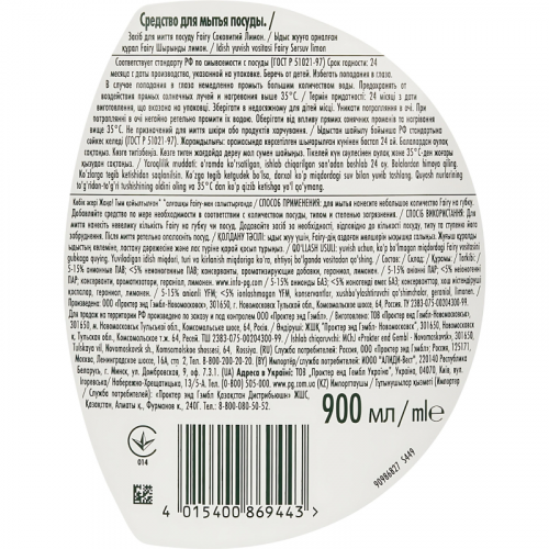 Средство для мытья посуды Fairy Сочный лимон гель 0,9 лНазначение: средство предназначено для мытья различной посуды от различных загрязнений. Эффективно удаляет жир даже в холодной воде.Способ применения: для мытья нанесите небольшое количество средства на губку или посуду. Добавляйте средство по мере необходимости. После мытья ополосните посуду.Меры предосторожности: беречь от детей. Избегать попадания в глаза. При попадании в глаза тщательно промыть их водой.Состав: 5%-15% анионные ПАВ; <5% неионогенные ПАВ; консерванты, ароматизирующие компоненты.Условия хранения: предохранять от воздействия прямых солнечных лучей и нагревания выше 35 C.Срок годности: 24 месяца с даты изготовления (дату изготовления см. на упаковке).