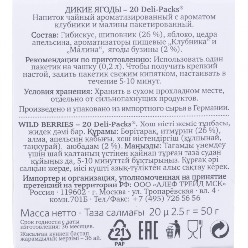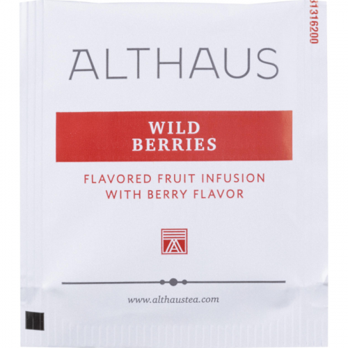 Чай фруктовый Althaus Wild Berries 20 пакетиков. Яркий аромат красных ягод и приятная кислинка каркаде гармонично сочетаются в композиции со вкусом душистого домашнего варенья. При изготовлении пакетированного чая Althaus используется то же высококачественное сырье, что и при изготовлении листового чая. Мелкая фракция чая в пакетиках обеспечивает более крепкий настой и быстрое заваривание. Специальная фильтр-бумага, из которой производятся пакетики, не влияет на вкус чая.Состав: гибискус, яблоко, шиповник, апельсиновая цедра, ежевика, аромат лесных ягод.Способ приготовления: залить чай кипятком, дать чаю настояться 3-5 минут.Количество пакетиков в упаковке: 20 штук. Тип упаковки: картонная коробка.Условия хранения: хранить в чистом, хорошо вентилируемом помещении без посторонних запахов при относительной влажности воздуха не более 70%.Страна производства: Германия.