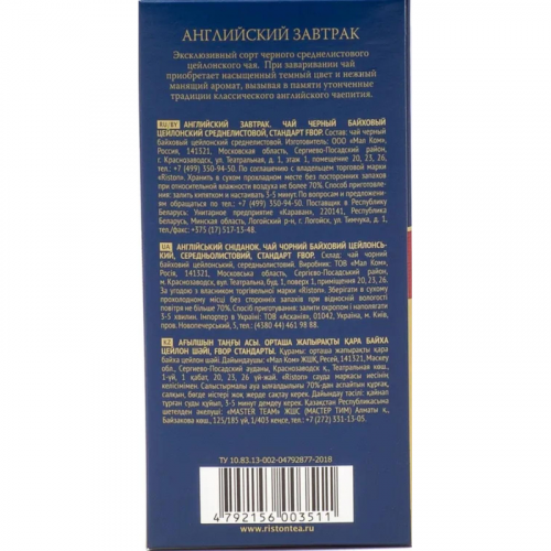 Чай черный Riston English Breakfast 100 пакетиков. Чай Riston English Breakfast в пакетиках - черный чай высшей категории с лучших плантаций Шри-Ланки. Крепкий настой с классическим элегантным вкусом и насыщенным ярким ароматом завоевал особую популярность во всем мире и стал непременным атрибутом традиционного английского завтрака.Состав: чай черный байховый мелкий.Способ приготовления: залить чай кипятком, дать чаю настояться 3-5 минут.Количество пакетиков в упаковке: 100 штук. Тип упаковки: картонная коробка.Условия хранения: хранить в чистом, хорошо вентилируемом помещении без посторонних запахов при относительной влажности воздуха не более 70%.Страна производства: Россия.