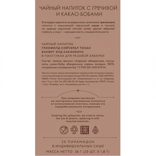 Чайный напиток травяной Greenfield Natural Tisane Buckwheat & Cocoabeans 20 пакетиков. Чайный напиток на основе гречихи с приятными нотами горького шоколада и легкой мятной свежестью в послевкусии. Уникальный вкус - настоящий тягучий шоколад без какого-либо ароматизатора на базе трендового кето-прогрессивного гречишного сырья.Состав: гречишный чай, мята, какао-бобы, лакрица.Способ приготовления: залить чай кипятком, дать чаю настояться 5 минут.Количество пакетиков в упаковке: 20 штук. Тип упаковки: картонная коробка.Условия хранения: хранить в чистом, хорошо вентилируемом помещении без посторонних запахов при относительной влажности воздуха не более 70%.Страна производства: Россия.