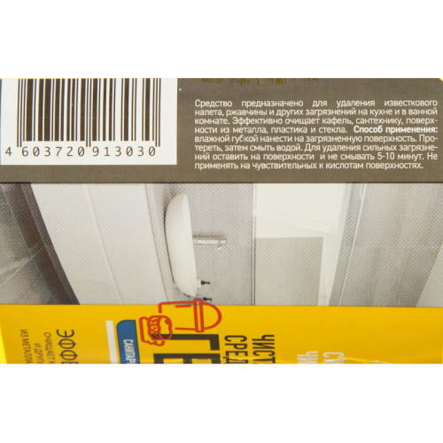 Средство для сантехники Сияние Чистоты 1 л. Назначение: Густой антибактериальный и антисептический гель для всех типов поверхностей туалета и ванной комнаты. Способ применения: Влажной губкой нанести на загрязненную поверхность. Протереть затем смыть водой. Для удаления сильных загрязнений оставить на поверхности и не смывать 5-10 минут. Не применять на чувствительных к кислотам поверхностях. Меры предосторожности: Средство предназначено для удаления известкового налета, ржавчины и других загрязнений на кухне и в ванной комнате с эффективно очищаєт кафель, сантехнику поверхности из металла пластика и стекла. Состав: Благодаря входящей в состав уникальной формуле с большой концентрации кислот, эффективно очищает и возвращает блеск поверхности, легко смывается водой не оставляя разводов. Условия хранения: Хранить при температуре от +5 до +30 °C. Срок годности: 24 месяца с даты изготовления.