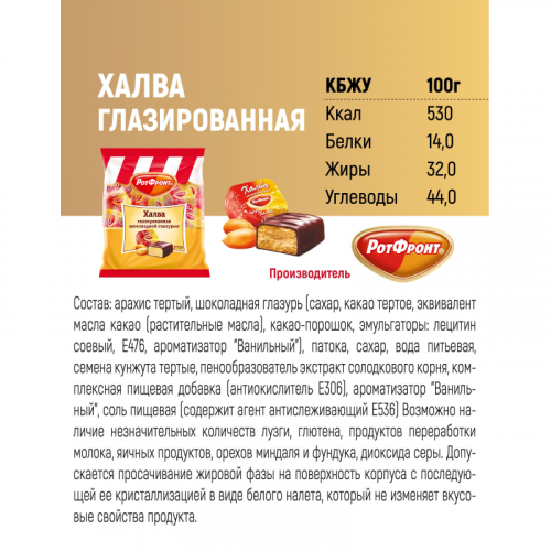 Золотистая арахисовая халва от фабрики 'Рот Фронт' с насыщенным ореховым вкусом, покрытая темной шоколадной глазурью. Слоистая, чуть рассыпчатая структура халвы легонько хрустит на зубах, раскрывая сладость и аромат арахиса. Легкие ванильные нотки придают вкусу нежности, темная, чуть терпкая шоколадная глазурь прекрасно дополняет нежную сладость халвы. Состав: арахис тертый, кондитерская глазурь (сахар, заменитель масла какао, какао-порошок, эмульгаторы Е322 и Е476, ароматизатор идентичный натуральному Ванильный), патока, сахар, экстракт солодкового корня, антиокислитель - аскорбиновая кислота, ароматизатор идентичный натуральному Ванильный, соль поваренная. Пищевая ценность: белкит- 15.0 г; жиры - 33.0 г; углеводы- 44.0 г; Энергетическая ценность: 528.0 ккал Условия хранения: При температуре от +5°С до +20°С Вес: 370 г Страна производства: Россия