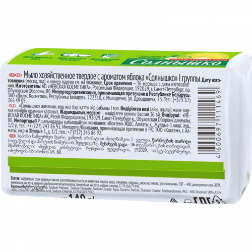Мыло хозяйственное Солнышко 70.5% 140 г. Назначение: Подходит для стирки всех типов тканей. Может использоваться для мытья рук, посуды и твердых поверхностей. Содержит глицерин. Дает обильную пену даже в холодной воде. Обладает приятным ароматом зеленого яблока. Не раздражает кожу рук. Глицерин защищает кожу от потери естественной влаги, обеспечивает смягчение и увлажнение. Способ применения: Вспенить, легкими движениями нанести на ткань, постирать, хорошо промыть водой. Состав: Натриевые соли жирных кислот растительных масел и животных жиров, вода, глицерин, отдушка, диоксид титана, триэтаноламин, ПЭГ - 400, динатриевая соль ЭДТА, лимонная кислота, натрий карбоксиметилцеллюлоза, бензойная кислота, натрия хлорид, Cl 74260, Cl 77492. Срок годности: 36 месяцев.