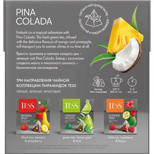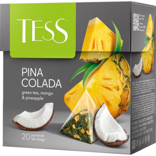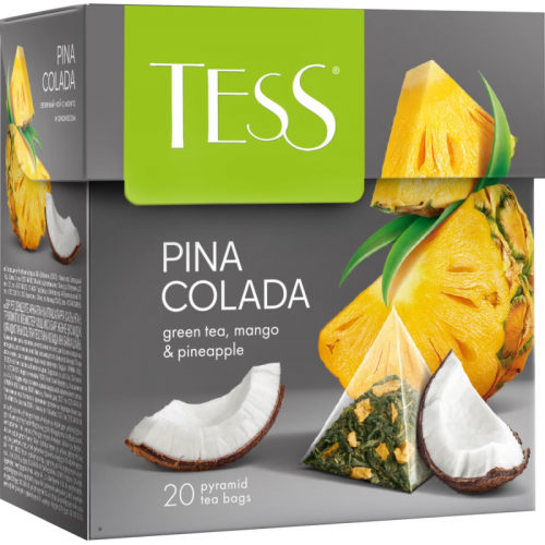 Чай зеленый Tess Pina Colada 20 пакетиков (манго, ананас). Яркость тропиков в палитре каждого дня - зеленый чай Pina Colada. Бленд с кусочками сладкого манго и пикантного ананаса - бесконечное наслаждение.Состав: чай зеленый байховый, ароматизатор пина колада, манго, лемонграсс, измельченные плоды ананаса.Способ приготовления: залить чай кипятком, дать чаю настояться 3-5 минут.Количество пакетиков в упаковке: 20 штук. Тип упаковки: картонная коробка.Условия хранения: хранить в чистом, хорошо вентилируемом помещении без посторонних запахов при относительной влажности воздуха не более 70%.Страна производства: Россия.