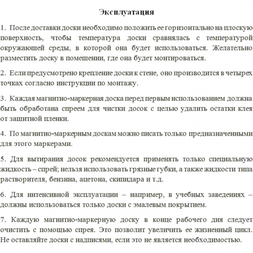 Доска настенная магнитно-маркерная лаковое покрытие в алюминиевом анодированном профиле. Основа доски ДСП 10 мм. Крепление закрытого типа 4-х точечное по углам доски. Набор крепежа и полочка для маркеров в комплекте. Для письма использовать специальные маркеры для магнитно-маркерных досок. при удалении записей используются только специальные губки-стиратели в комбинации со специализированным спреем, для более тщательной очистки полотна. Упаковка - деревянная рейка и оргалит. Размер доски 1200x1800 мм. Габаритный размер (вместе с рамкой) - 24x1830x1220 мм. Гарантия 1 год. Соблюдение правил ухода и эксплуатации способно обеспечить срок службы рабочей поверхности магнитно-маркерной доски более 10 лет. Страна производитель Россия. За счет использования премиум профиля овального сечения шириной 21 мм конструкция доски имеет увеличенную прочность и надежность. Размер рабочей поверхности: 117x178 см. Для удаления пленки потяните за верхний свободный угол, пленка легко отойдет от рабочей поверхности. При необходимости проведите вдоль рамы канцелярским ножом. Законодательные и технические документы