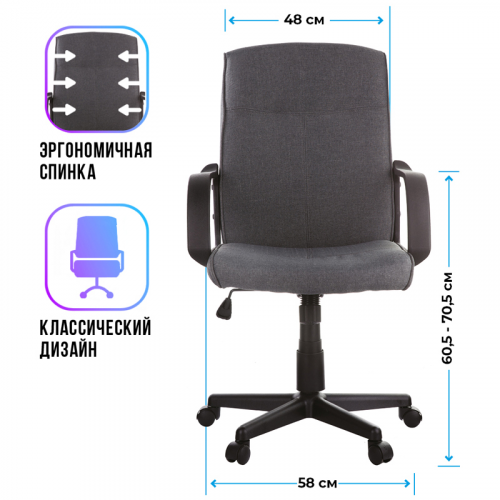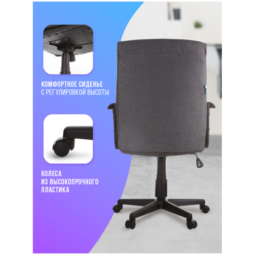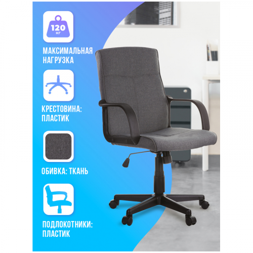 Максимальная нагрузка – 120 кг. Газпатрон 3 класса по стандарту DIN EN 16955. Каркас – немонолитный, материал набивки – вспененный полиуретан, крестовина – пластик, материал обивки – ткань серого цвета. Механизм качания с возможностью фиксации кресла в рабочем положении. Гарантийный срок – 12 месяцев.