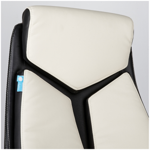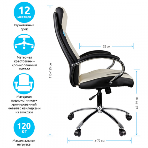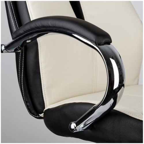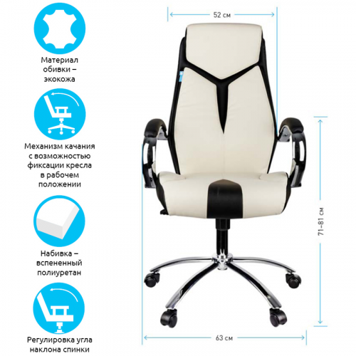 Механизм качания с возможностью фиксации кресла в рабочем положении. Каркас – немонолитный, материал набивки – вспененный полиуретан, крестовина – хромированный металл, материал обивки – чёрно-бежевая экокожа. Гарантийный срок – 12 месяцев.