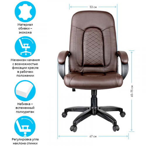 Контрастное выделение элементов спинки и сиденья добавляет дизайну солидности и лоска, делая его образцом бизнес-классики. Каркас – немонолитный, материал набивки – вспененный полиуретан, крестовина – пластик, материал обивки – экокожа коричневого цвета. Модель имеет пластиковые подлокотники с мягкими накладками. Гарантийный срок – 24 месяца.