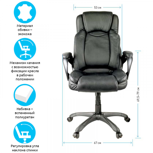 Максимальная нагрузка составляет 120 кг. Газпатрон 3 класса по стандарту BIFMA X5.1. Каркас – немонолитный, материал набивки – вспененный полиуретан, крестовина –пластик, материал обивки – экокожа чёрного цвета. Модель имеет пластиковые подлокотники с накладками из экокожи. Механизм качания с возможностью фиксации кресла в рабочем положении. Гарантийный срок – 12 месяцев.