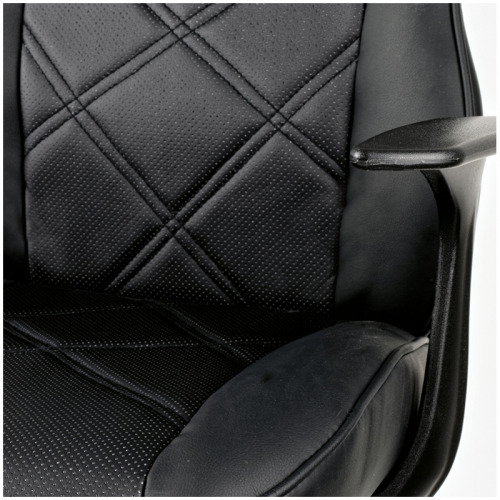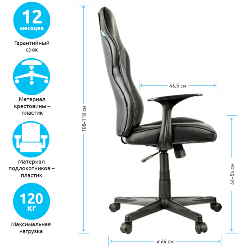 Максимальная нагрузка составляет 120 кг. Газпатрон 3 класса по стандарту DIN EN 16955. Каркас – немонолитный, материал набивки – вспененный полиуретан, крестовина – пластиковая, подлокотники – пластиковые, материал обивки – экокожа чёрного цвета. Механизм качания с возможностью фиксации кресла в рабочем положении. Гарантийный срок – 12 месяцев.