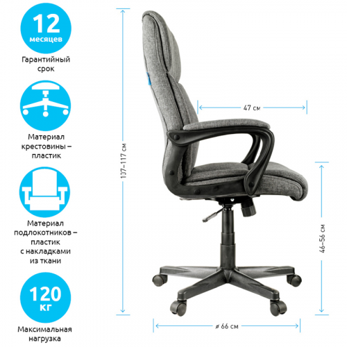 Максимальная нагрузка составляет 120 кг. Газпатрон 3 класса по стандарту BIFMA X5.1. Каркас – немонолитный, материал набивки – вспененный полиуретан, крестовина – пластик, материал обивки – ткань серого цвета. Модель имеет пластиковые подлокотники с накладками из ткани. Механизм качания с возможностью фиксации кресла в рабочем положении. Гарантийный срок – 12 месяцев.