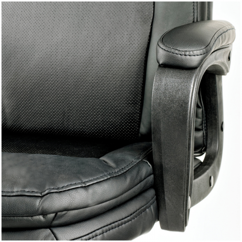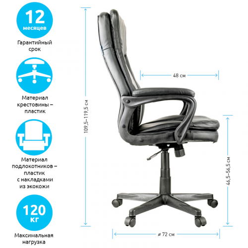 Максимальная нагрузка составляет 120 кг. Газпатрон 3 класса по стандарту BIFMA X5.1. Каркас – немонолитный, материал набивки – вспененный полиуретан, крестовина – пластик, материал обивки – экокожа чёрного цвета. Модель имеет пластиковые подлокотники с накладками из экокожи. Механизм качания с возможностью фиксации кресла в рабочем положении. Гарантийный срок – 12 месяцев.