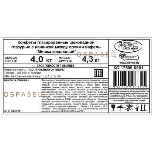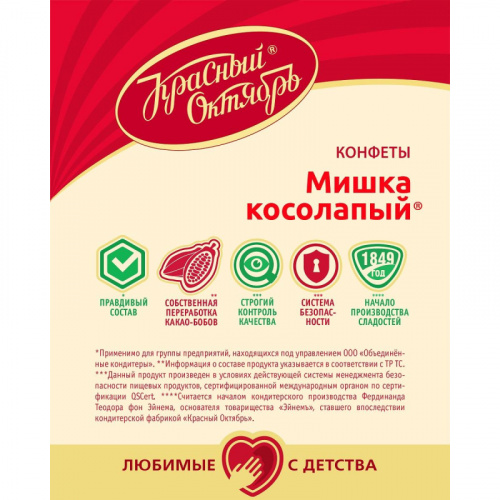 Легендарные конфеты Мишка косолапый от фабрики Красный Октябрь - тонкие вафельные пластинки, прослоенные пралине из жареного тертого миндаля, покрытые шоколадной глазурью. Нежный хруст воздушных вафель, терпкий вкус какао с тонкими нотками ванили и ореха, насыщенный шоколадный дух - вкус и аромат, знакомые с детства. Состав: шоколадная глазурь (сахар, какао тертое, эквивалент масла какао (рафинированные, дезодорированные, фракционированные, негидрогенизированные растительные масла (пальмовое, ши)), какао-порошок, эмульгаторы: лецитин соевый, Е476, ароматизатор Ваниль), сахар, ядро ореха миндаля тертое, масло какао, вафли (вода питьевая, мука пшеничная хлебопекарная высшего сорта, масло подсолнечное рафинированное дезодорированное, соль, эмульгатор лецитин соевый, разрыхлитель гидрокарбонат натрия), антиокислитель аскорбиновая кислота, ароматизатор Ваниль. Возможно наличие незначительного количества фундука, молочных продуктов, арахиса. Пищевая ценность на 100г продукта, г: белки - 6 г; жиры - 30 г; углеводы - 58 г. Энергетическая ценность: 530 ккал. Условия хранения: при температуре от 15 до 21 С.