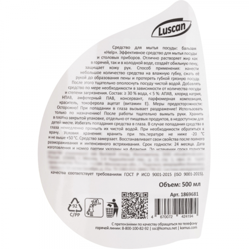 Средство для мытья посуды Luscan Бальзам-апельсин гель 0.5 л с дозаторомНазначение: эффективное средство для мытья посуды и столовых приборов. Отлично растворяет жир, как в горячей, так и в холодной воде, создаёт обильную пену, защищает кожу рук.Способ применения: нанести небольшое количество средства на влажную губку, сжать её рукой до образования пены и протереть губкой грязную посуду. После этого тщательно ополоснуть посуду чистой водой. Добавлять средство по мере необходимости в зависимости от количества посуды и степени загрязнения.Меры предосторожности: осторожно. При попадании в глаза вызывает раздражение. Использовать только по назначению. После работы тщательно вымыть руки. Хранить в плотно закрытой упаковке, отдельно от пищевых продуктов, в недоступном для детей месте. Избегать попадания средства в глаза. В случае попадания средства в глаза немедленно промыть их чистой водой. При необходимости обратиться к врачу.Состав: ≥ 30 % вода, < 5 %: АПАВ, хлорид натрия, НПАВ, Амф. ПАВ, консервант, парфюмерная композиция, краситель, токоферола ацетат (витамин Е).Условия хранения: хранить при температуре не ниже −20 C и не выше +50 C. Средство замерзает, восстанавливает свои свойства после полного размораживания и интенсивного встряхивания.Срок годности: 24 месяца с даты изготовления (дату изготовления см. на упаковке).